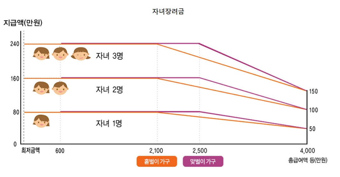 소득 기준 확대: 총소득 4,000만 원 미만 가구에서 7,000만 원 미만 가구까지 대상 확대돼서 수급 대상자가 2023년보다 약 80만 가구 증가합니다. 자녀 1인당 최대지급액 80만 원에서 100만 원으로 인상되었습니다.