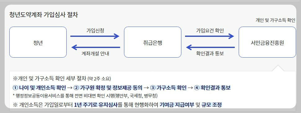 1) 청년이 은행에 가입 신청을 하면 취급 은행은 가입요건을 확인한 후 서민금융진흥원에 이를 통보합니다. 심사원에서는 약 2주가 심사를 진행한 후 확인 결과를 은행에 통보합니다. 은행은 이 통보를 받으면 청년에게 계좌개설을 안내합니다.