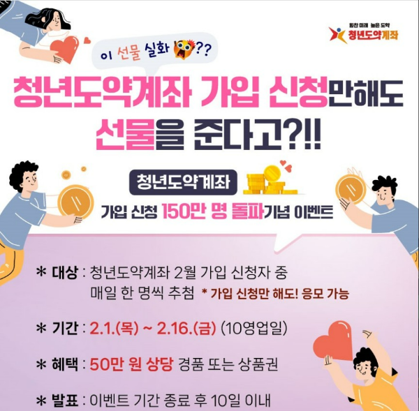 청년도약 계좌가 가입자 150만 명을 돌파한 기념으로 경품 이벤트를 개최합니다. 이벤트 기간은 2024년 2월 1일부터 16일까지이며, 기간 중 매일 1명을 추첨해 50만 원 상당의 경품 또는 상품권을 제공합니다. 이 이벤트는 가입 신청만 해도 응모가 가능합니다.