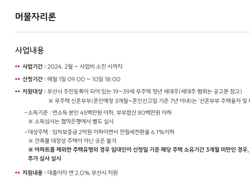 - 신청일 기준 부산광역시에 주민등록이 되어 있는 만 19세부터 만 39세까지 무주택 청년 세대주가 대상입니다.